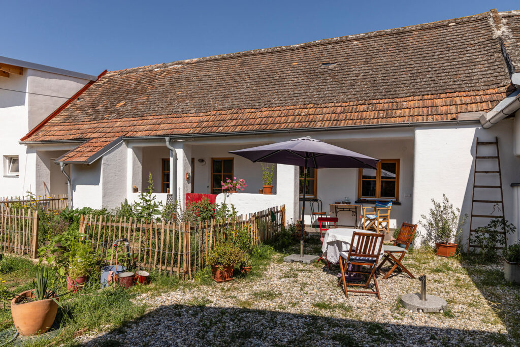 Für die Außenwände wurde traditioneller Sumpfkalkputz verwendet. Auch dem Innenhof wurde eine sanfte Neugestaltung zuteil: Die betonierte Mistgrube wurde in ein Hochbeet umgewandelt und ist heute der Mittelpunkt des idyllischen Gastgartens. Soweit möglich wurde auf weitere Änderungen im Innenhof verzichtet, um die angenehme, ruhige Atmosphäre, die von ihm ausgeht, beizubehalten.